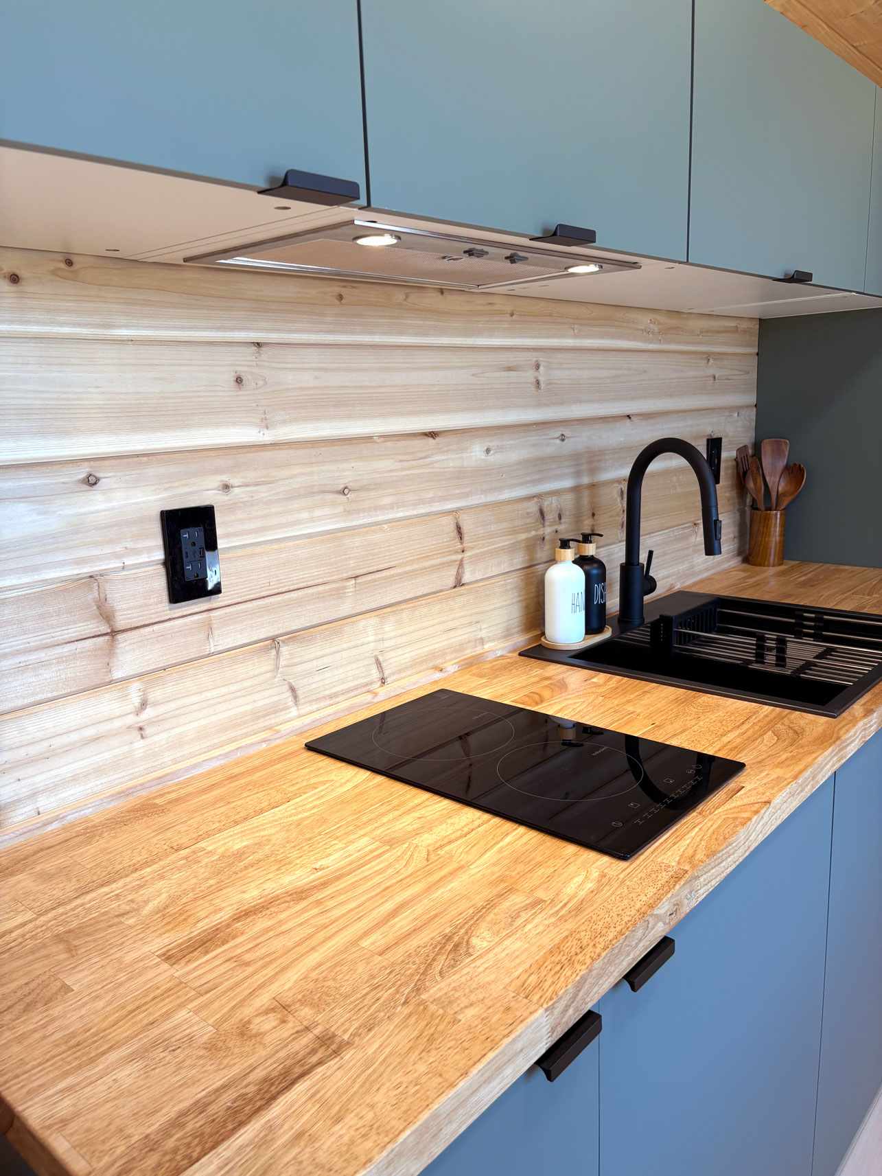 Kitchen: Electric induction cook top |Full-sized workstation sink | Standing refrigerator/freezer | Ample cabinets/storage | Butcher block counters