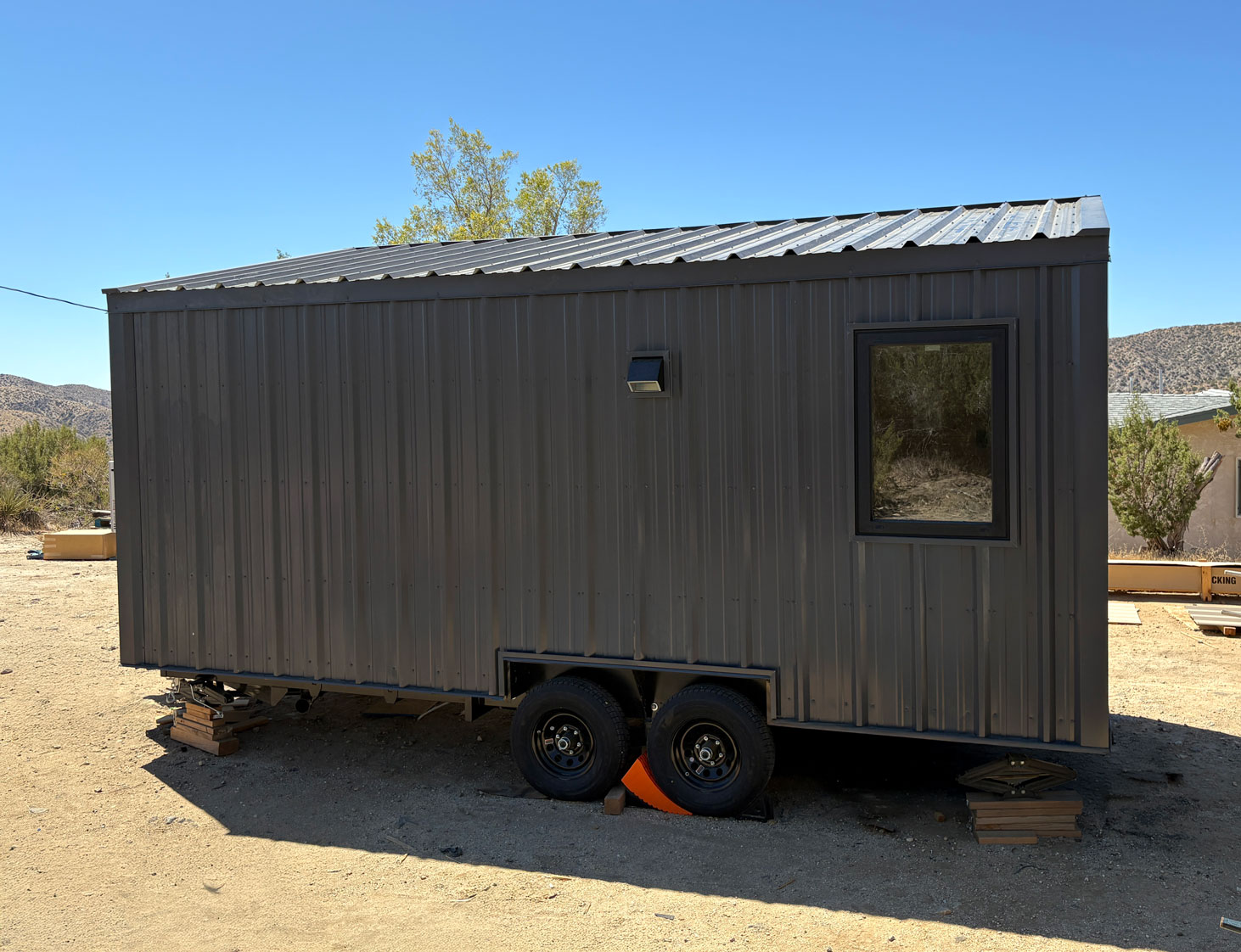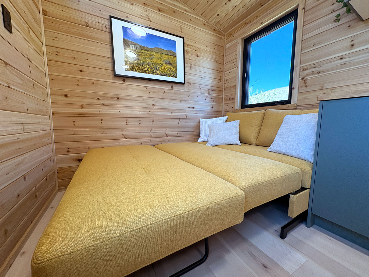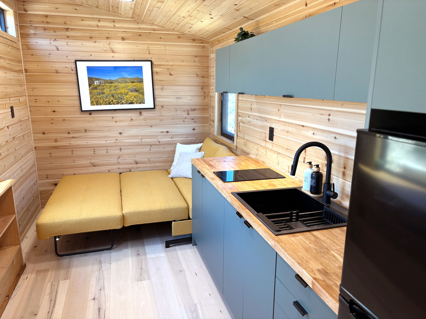 Discover the versatility of our Studio Tiny House. This thoughtfully designed space features a comfortable sofa bed, a well-equipped kitchen, and a convenient bathroom with closet storage. High ceilings create an open and airy interior, making it perfect as a guest house, mother-in-law suite, or primary residence.