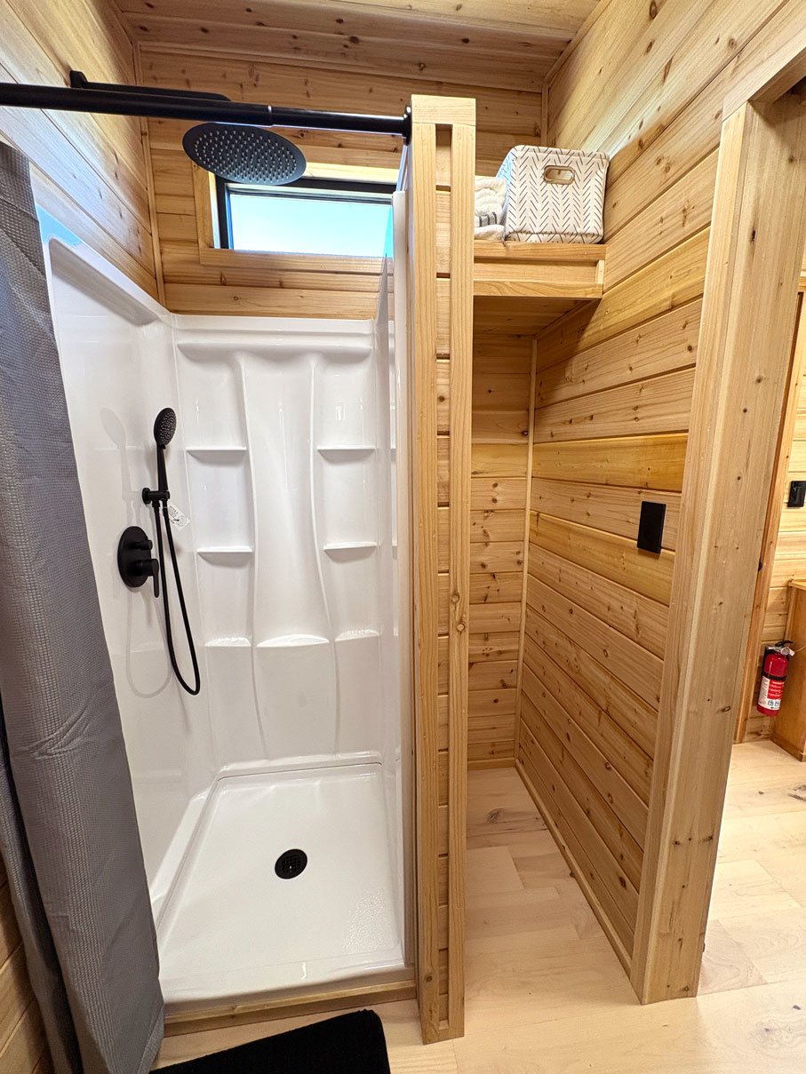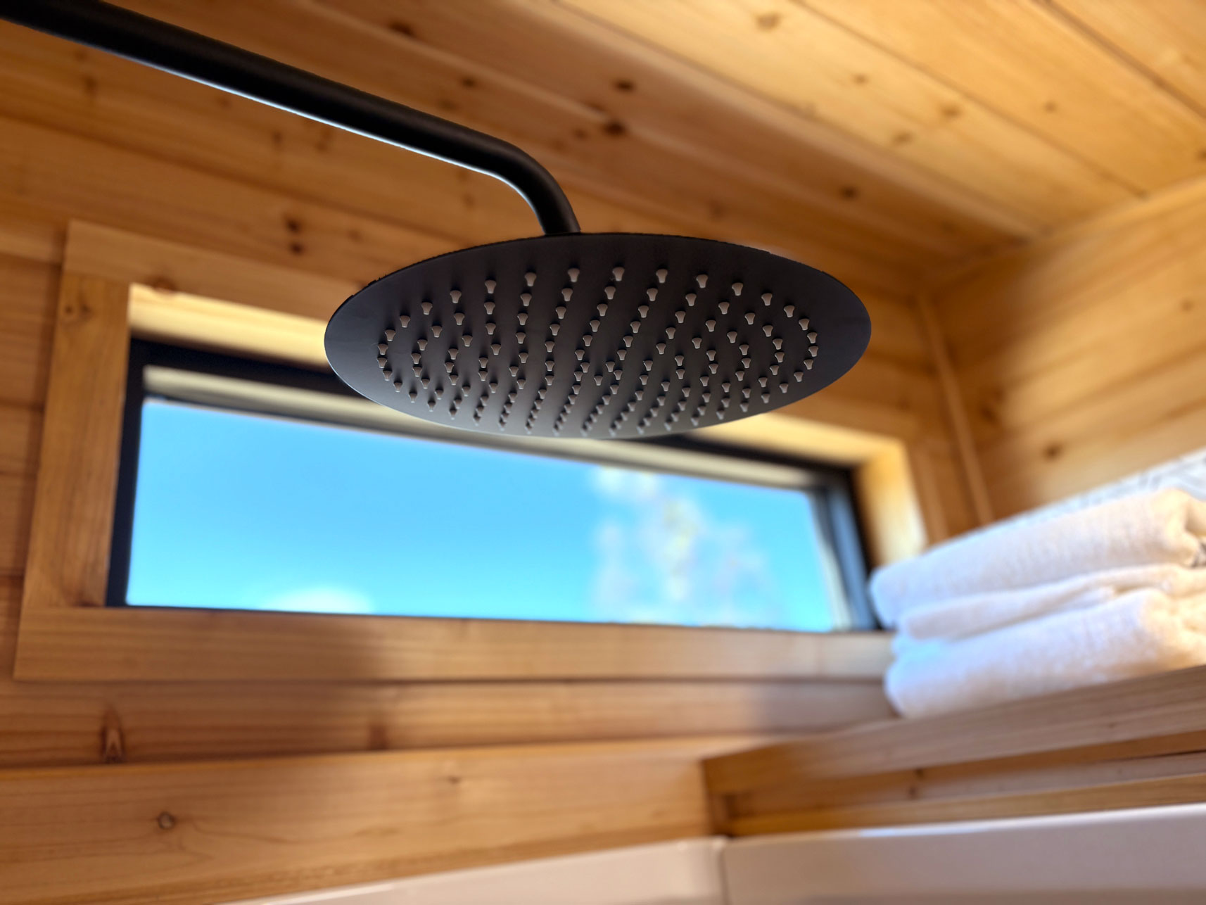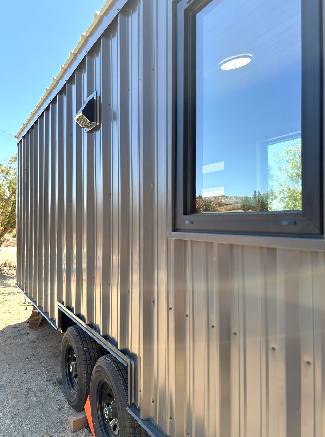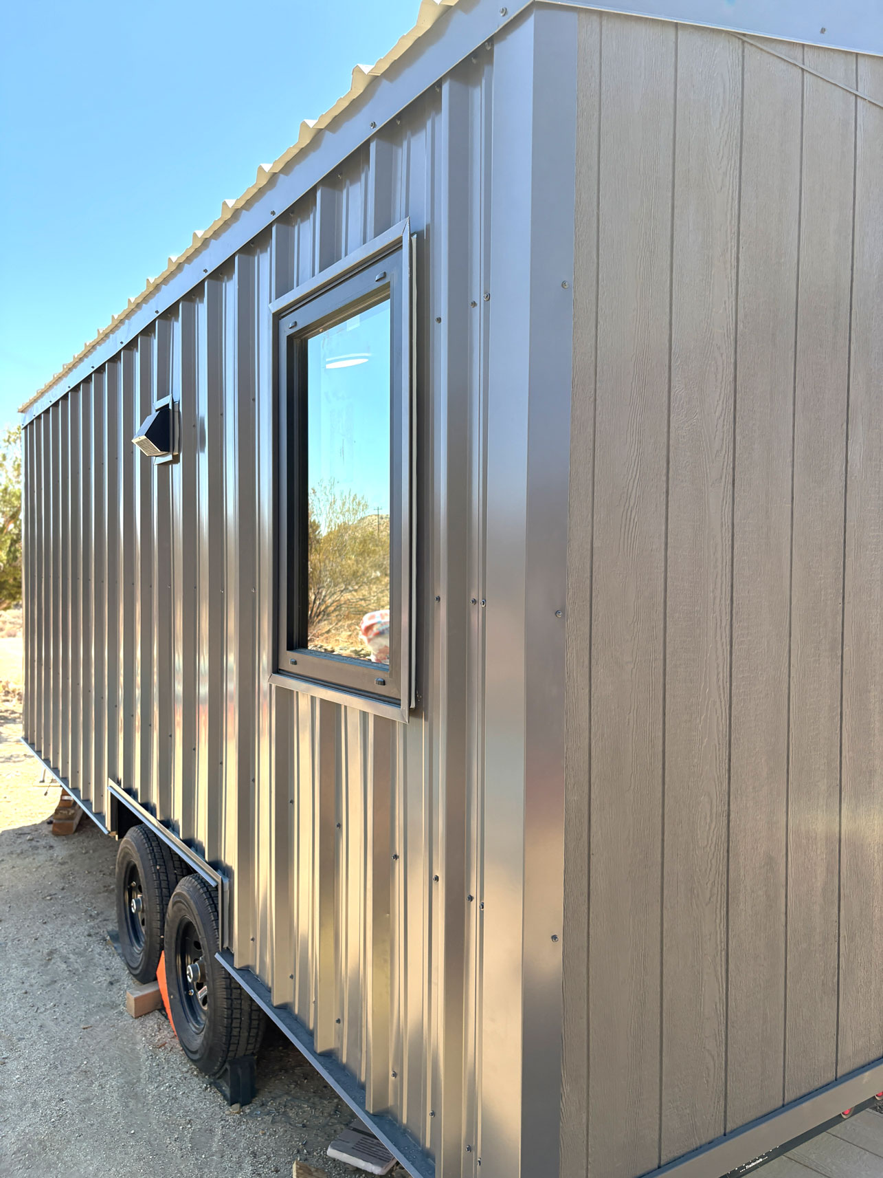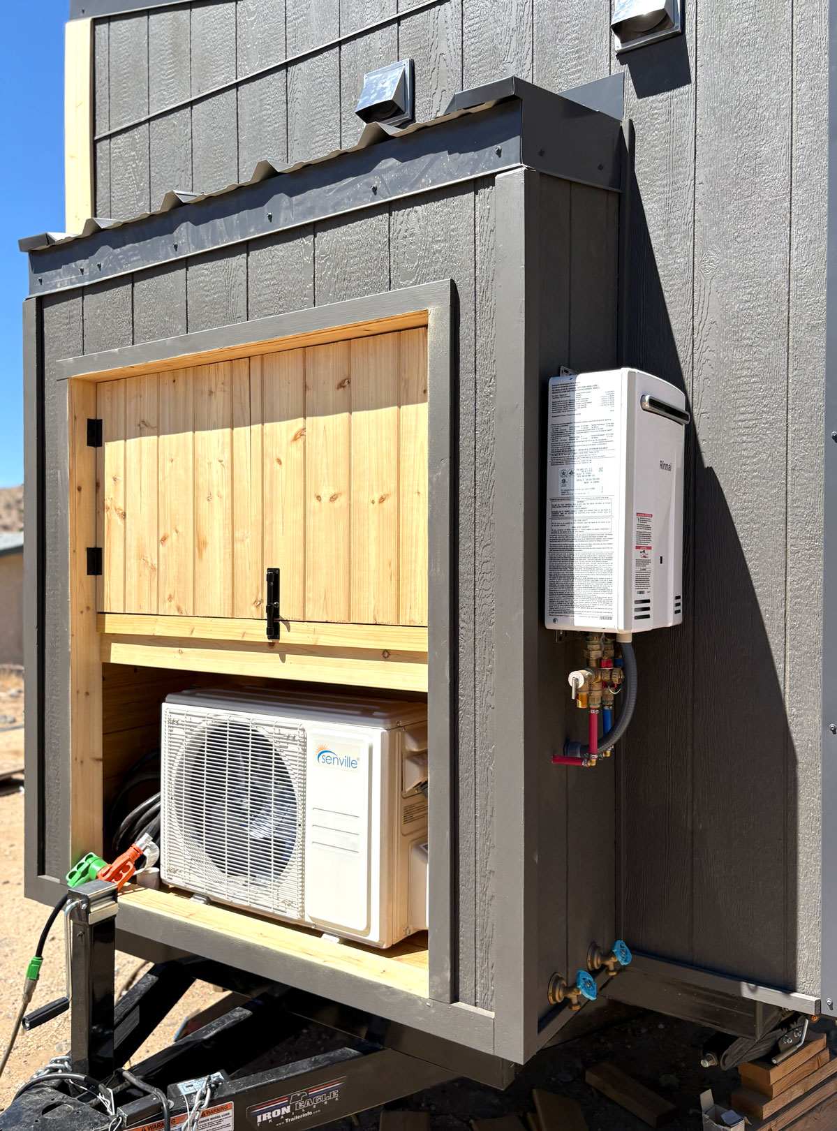 Exterior: 50amp power, plug-in ready | LP instant water heater | 12000 BTU mini-split Heat & AC | 18 gauge steel roofing | Open jointed cladding